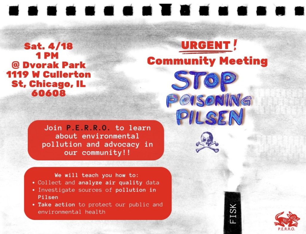 Events P.E.R.R.O. Public Calendar UPCOMING EVENTS STOP POISONING PILSEN Community Meeting: Saturday, April 18th from 1-3:30pm. Dvorak Park (1119 W. Cullerton St) Events Events