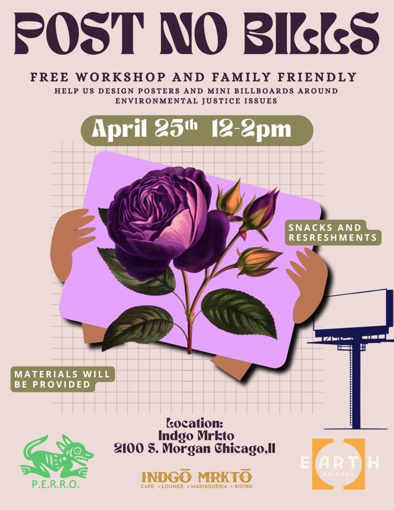 Cafecito y Arte (w/ Spanish sin Pena) will focus on connecting at La Malinche Coffee & Tea House, practicing Spanish with people of all levels. Then, we will take a short walk to see an environmental justice site in the neighborhood, Fisk Coal Plant. On the way back, we will gather at Indgo Mrkto for Post No-Bills, a free workshop led by our Earth Art team to design posters and mini-billboards for activism. All art materials will be provided; this is a family-friendly event. (NOTE: Please RSVP for Cafecito y Arte HERE)
